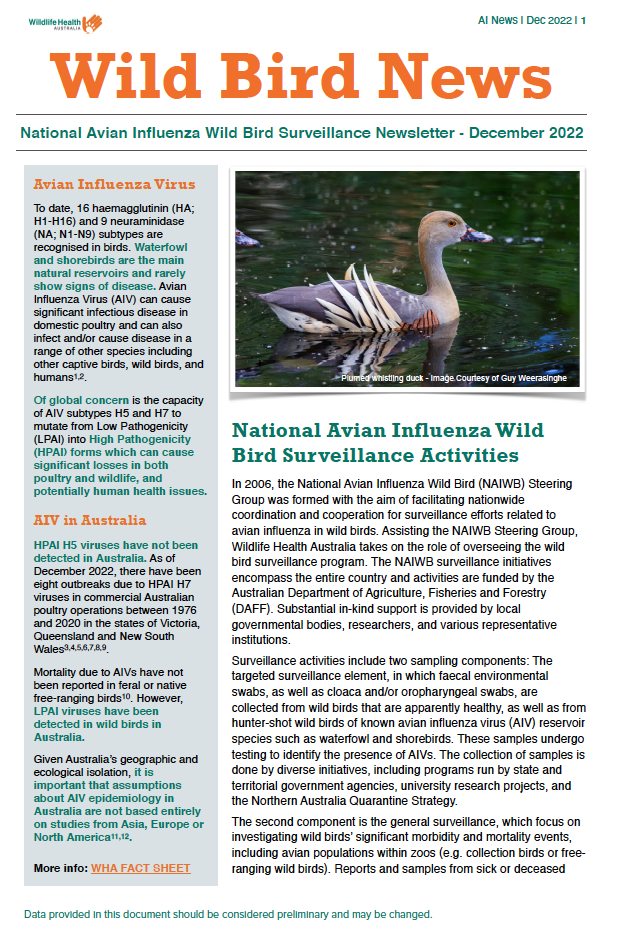 Every three months, information submitted to the national electronic Wildlife Health Information System (eWHIS) is collated by WHA and submitted to a quarterly publication: Animal Health Surveillance Quarterly (AHSQ). This publication is produced by Animal Health Australia (AHA) as part of Australia's national animal health information program.